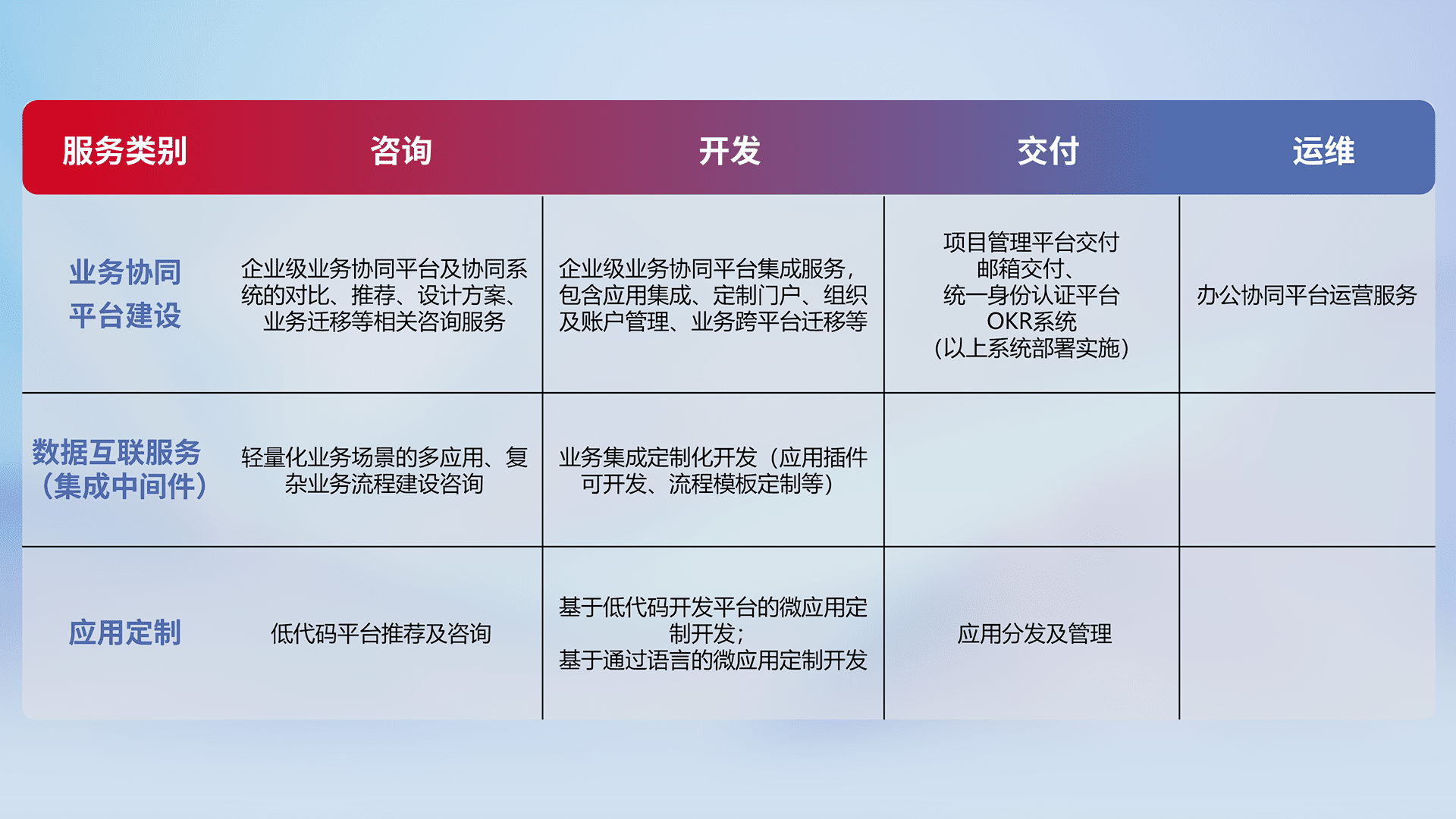 针对钉钉、、企微、、、IDaas等平台级产品提供产品的规划、、方案、、、、交付、、、、定制化开发等服务,,实现如统一协同办公、、、、智能客户服务、、混合会议管理、、、、智能数据查询、、、、等业务场景,,,,实现数字化转型。。