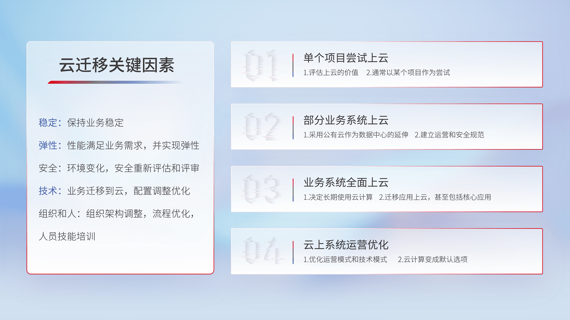 结合实际业务,,从规划设计、、云平台选型、、、云原生改造、、、数据迁移、、、、集成交付,,,,迁移全过程为客户识别最佳上云路径,,做好风险识别管理,,,设计网络架构、、、身份权限、、安全审计合规、、、操作审计、、、、日志审计、、监控告警策略、、、多站点容灾设计等,,,,对云上基础设施进行整体规划,,提升IT治理水平,,,,以满足弹性、、、、高可用、、、、高性能的需求。。。。