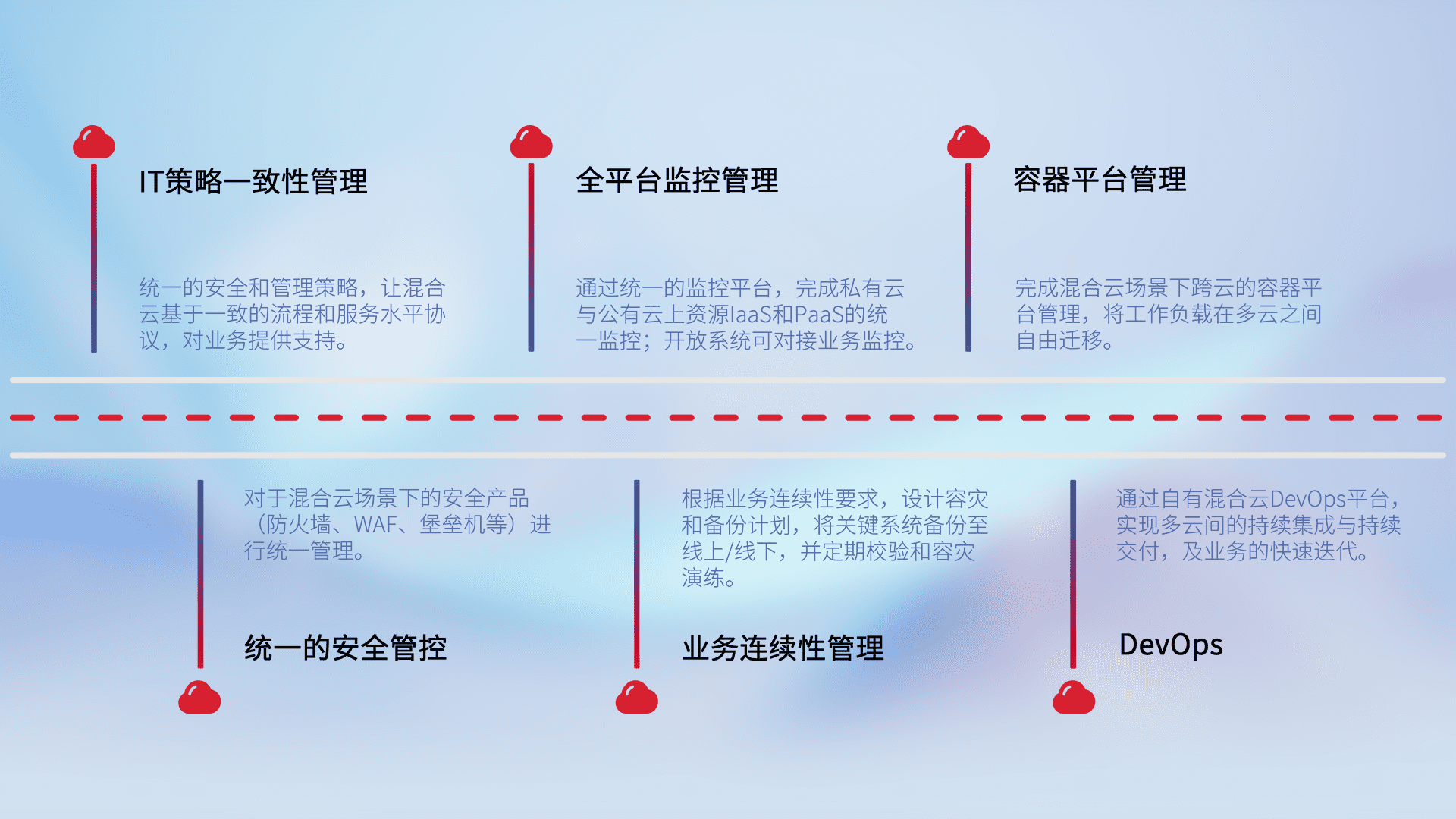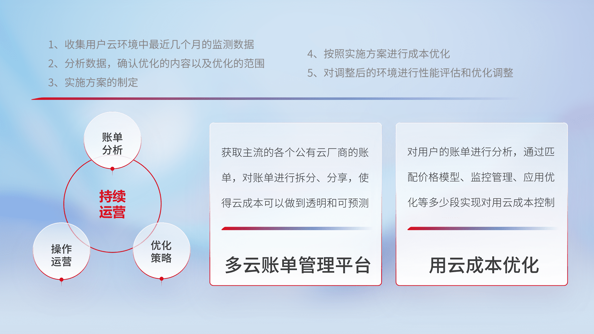 通过多云纳管,,,以统一的资源数据模型把客户的云资源进行抽象和封装,,进而实现对多云资源的统一操作,,保障云资源管理的可靠性、、稳定性与可用性。。。。量身定制化运维内容,,,配置、、开发运维、、、补丁管理、、备份、、、监控、、、、认证和访问管理、、、、审计和日常巡检等,,保障在用云过程中的可靠度,,稳定度以及高可用率。。